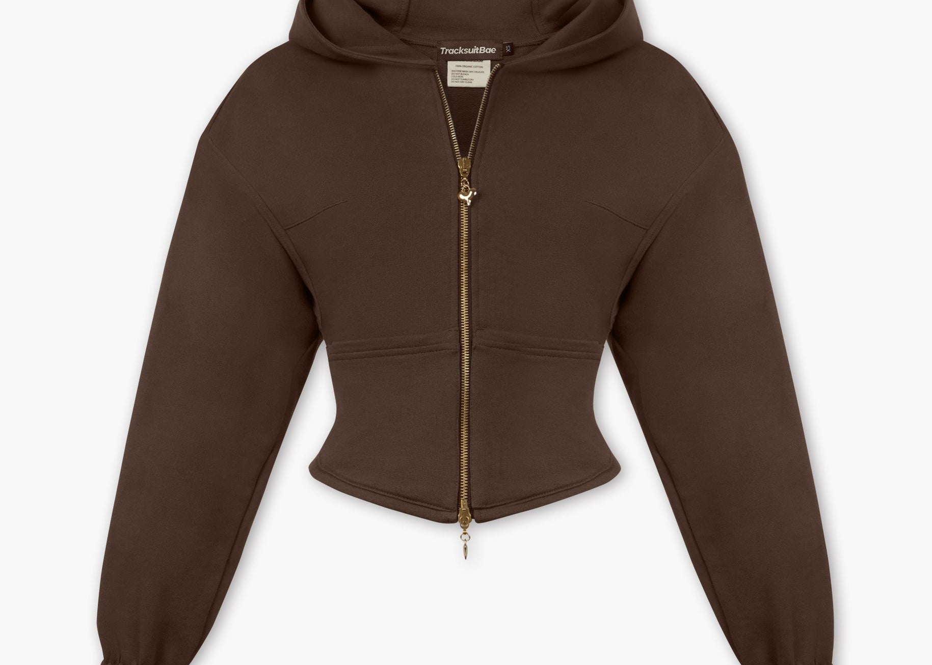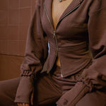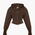 A hoodie that hugs you in all the right places. Looks like a corset, but feels like a cloud.This is the hoodie you throw on when you want to feel cozy and hot. NOW in Chocolate Martini & a 2 way zip