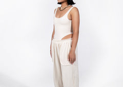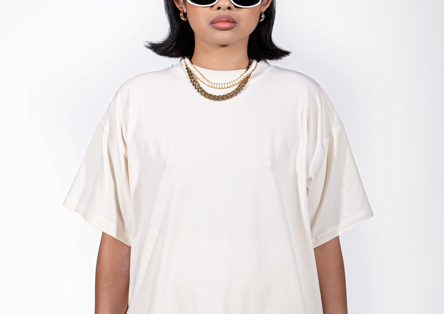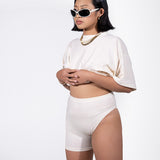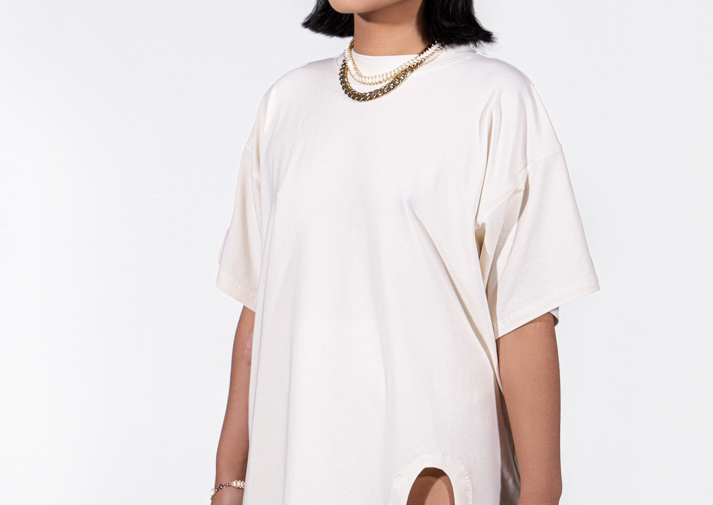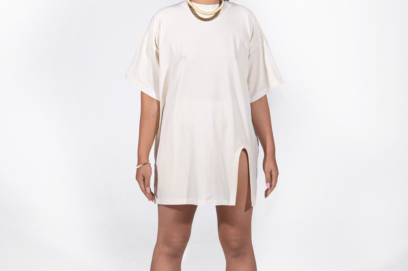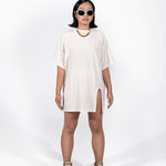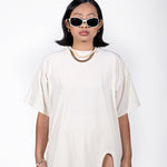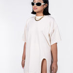 [POLARO] Oversized Cut Out Tee Dress & One Leg Short in Oat Latte