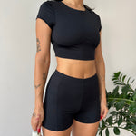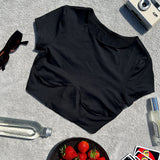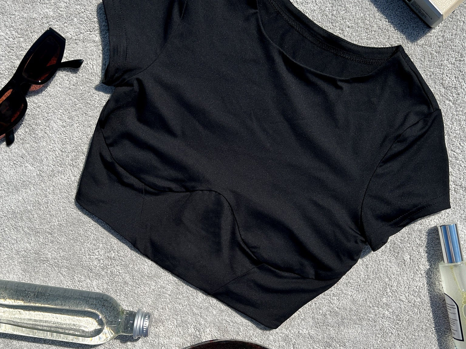 [ SWIM ] Panelled Short Sleeve Swim Crop Top in Black