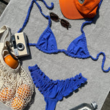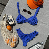Make a statement with our Ruffle Bikini Bottoms in Indigo Illusion. These bottoms feature flirty ruffle detailing that adds a playful and feminine touch to your swimwear ensemble. Available in both thong and regular styles, they offer options to suit your comfort level and personal style.